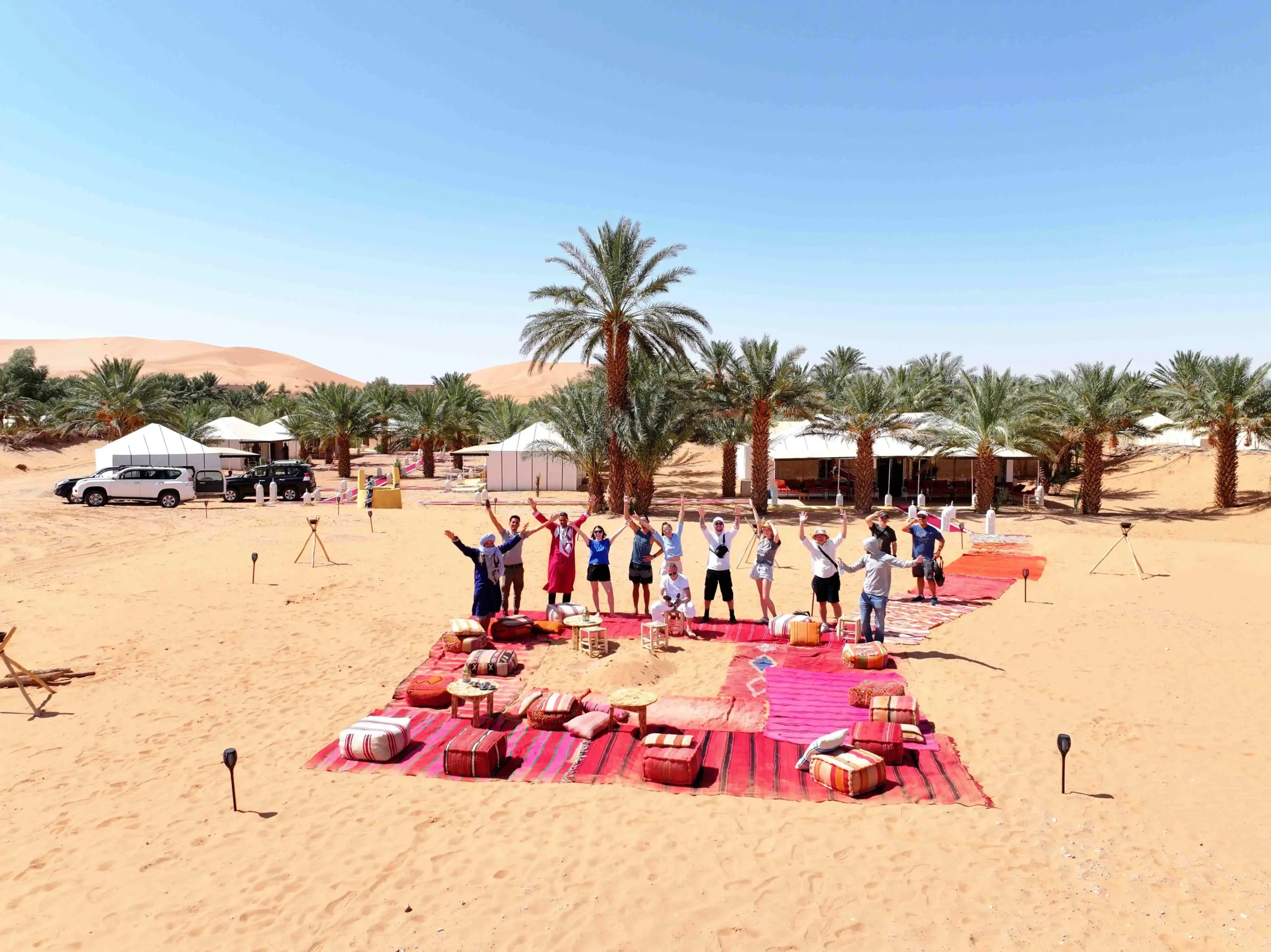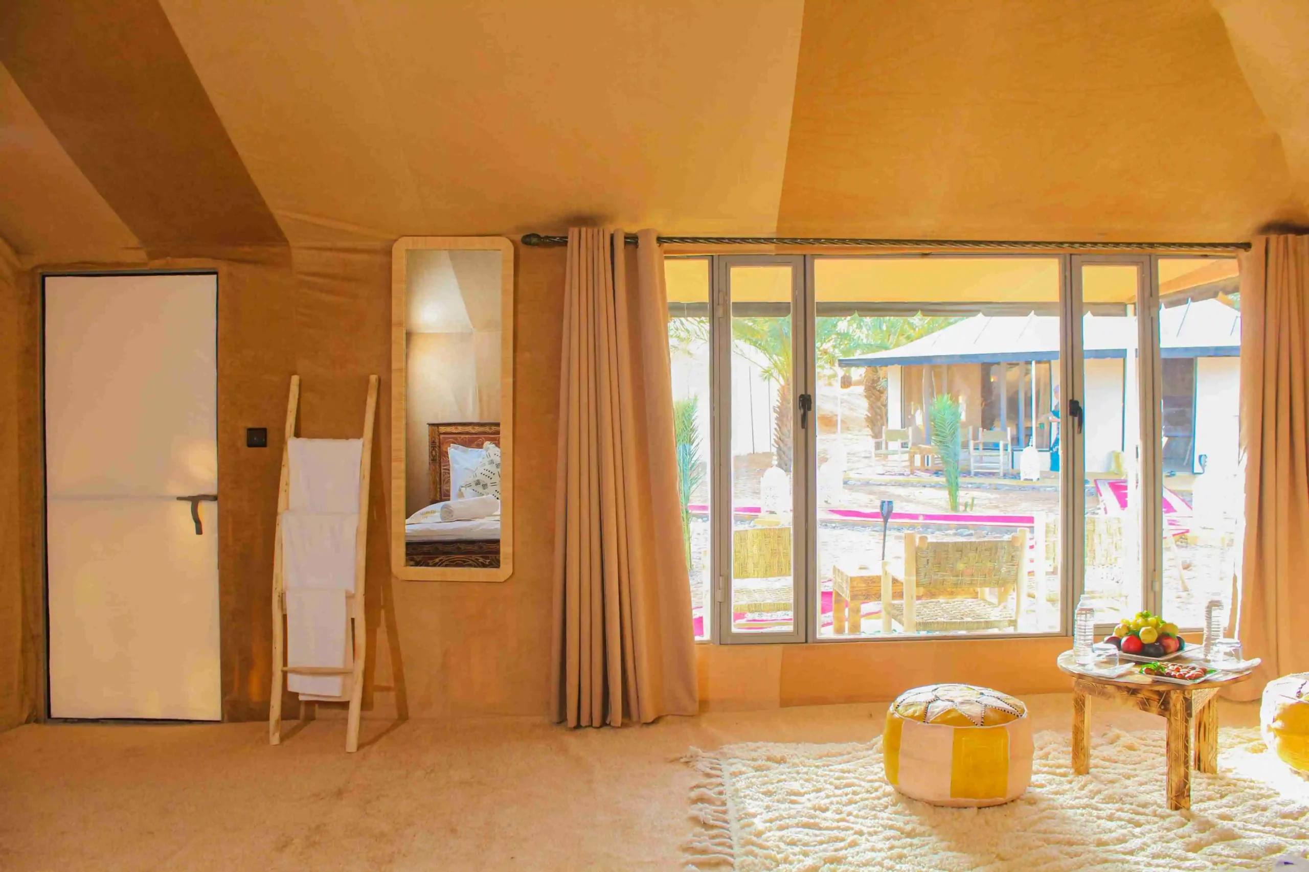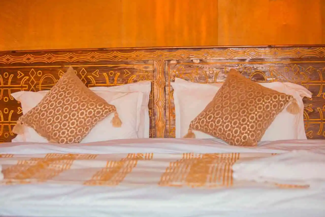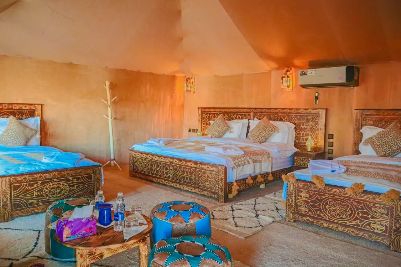 Morocco Luxury Desert Camp is a boutique glamping retreat set in the heart of Merzouga’s Erg Chebbi dunes, steps from serene Yasmina Lake. Hidden inside a tranquil palm oasis and hosted by welcoming local Berber teams, the camp blends comfort with true desert tradition. Sleep in spacious, air-conditioned tents with en-suite bathrooms, dine on refined Moroccan cuisine by lantern light, and fill your days with unforgettable experiences—from camel rides over golden dunes and 4×4 dune adventures to sunset on a high dune and stargazing under crystal-clear skies. Whether you’re celebrating, seeking quiet, or exploring the Sahara for the first time, this is the desert—slow, intimate, and beautifully crafted.